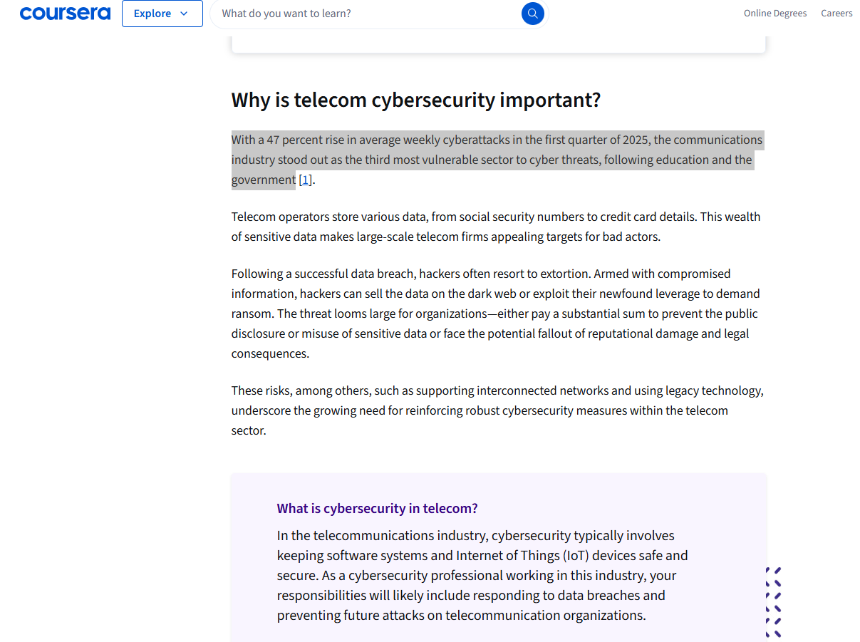 Telecom providers sit at the center of our personal data and communication, which makes them a favorite target for hackers. In early 2025, cyberattacks on telecoms rose by 47%, making them the third most-attacked sector after education and government according to coursera.org