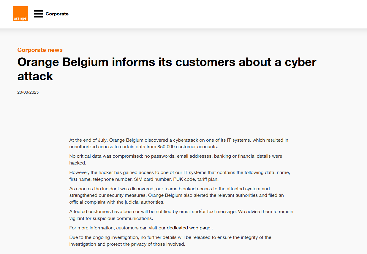 Orange Belgium – a major telecom operator serving over 3 million customers in Belgium revealed that it suffered a significant data breach in July 2025. Hackers gained unauthorized access to one of Orange’s IT systems containing customer account records.