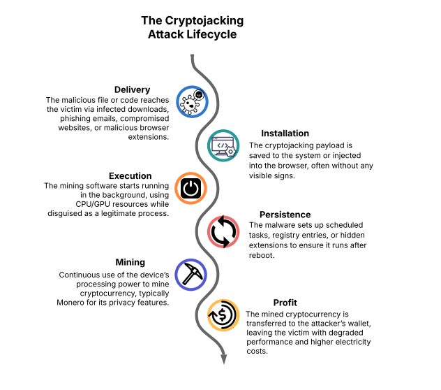 A cryptojacker’s goal is to stay hidden while continuously mining. Here’s the typical process: