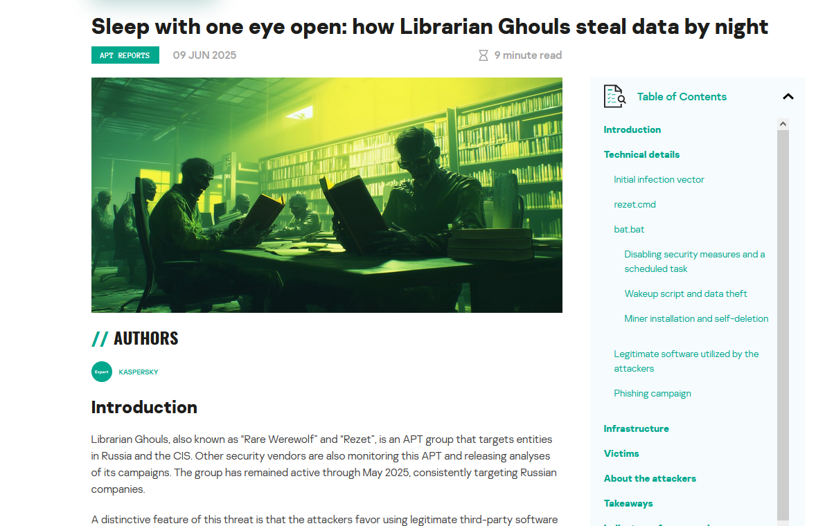 In June 2025, Kaspersky published an in-depth report on a group they call Librarian Ghouls (also tracked as Rare Werewolf and Rezet). This APT has been active since early 2025, focusing heavily on targets in Russia and the CIS. While initially linked to classic data-theft campaigns, investigators found the group was also deploying cryptojacking malware to quietly monetize its operations.