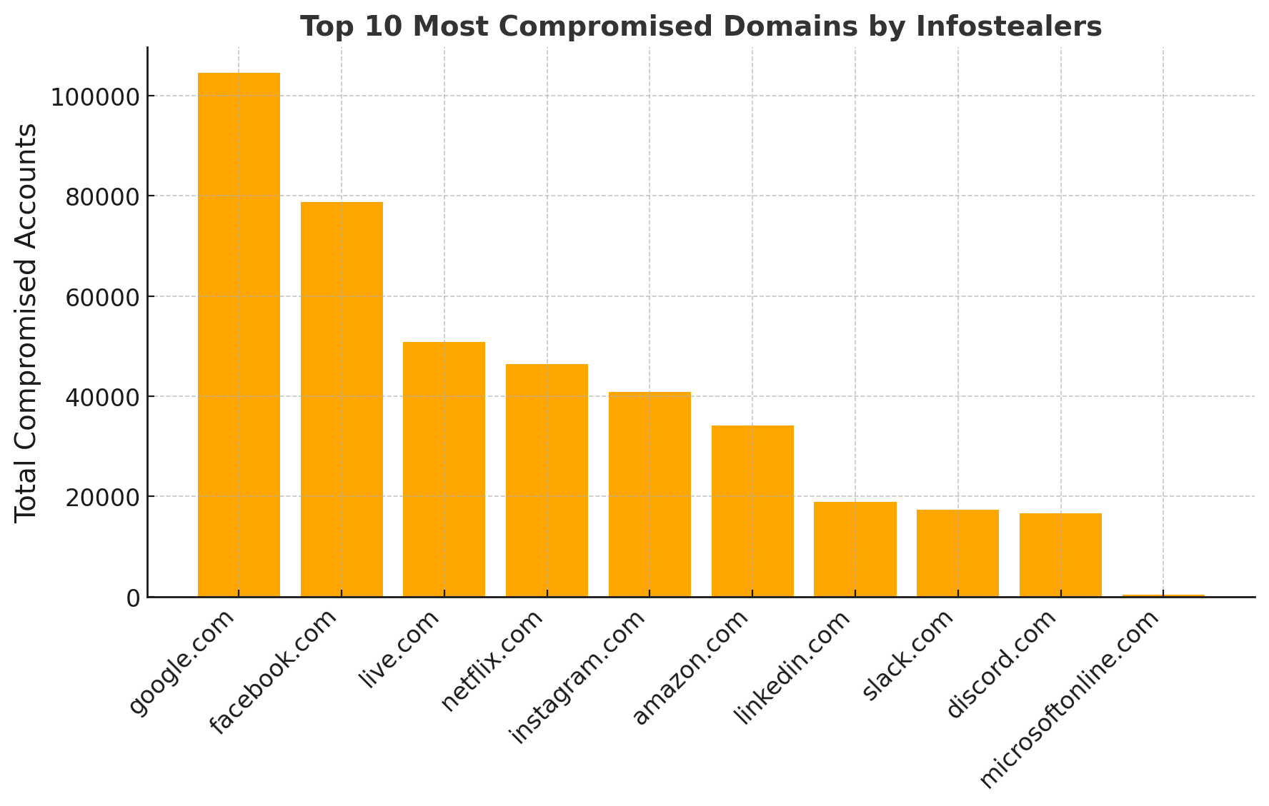 Domains: Popular platforms such as Google, Facebook, Live.com, and Instagram remain the most compromised, reflecting their role as primary identity providers and gateways to other services.