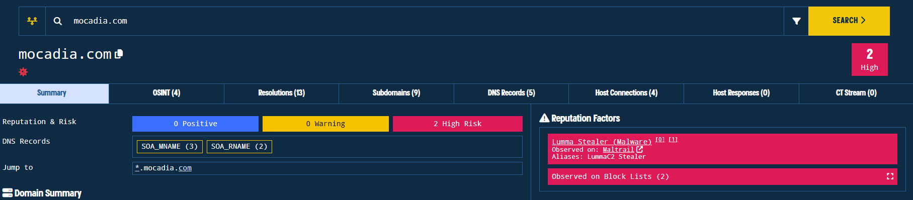 Exfiltration : Stolen information is sent to the C2 server at mocadia[.]com. In some samples, Lumma is configured to upload via Telegram bots, further complicating tracking.