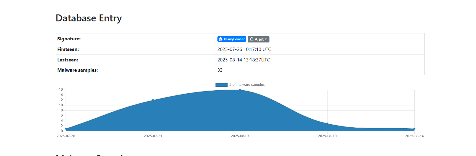 According to MalwareBazaar telemetry, the first samples of XTinyLoader were seen on July 26, 2025, with activity peaking in early August before tapering off by August 14, 2025.
