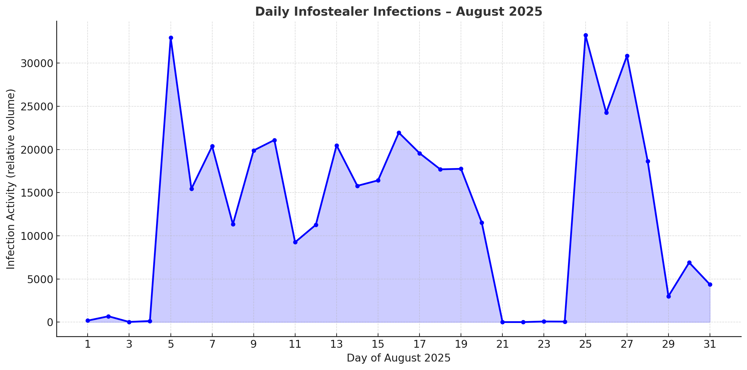 The daily trend highlights how infostealer campaigns unfolded in sharp waves, with quiet periods followed by sudden spikes. Activity intensified mid to late July, showing a pattern of coordinated, large-scale campaigns rather than steady infections.