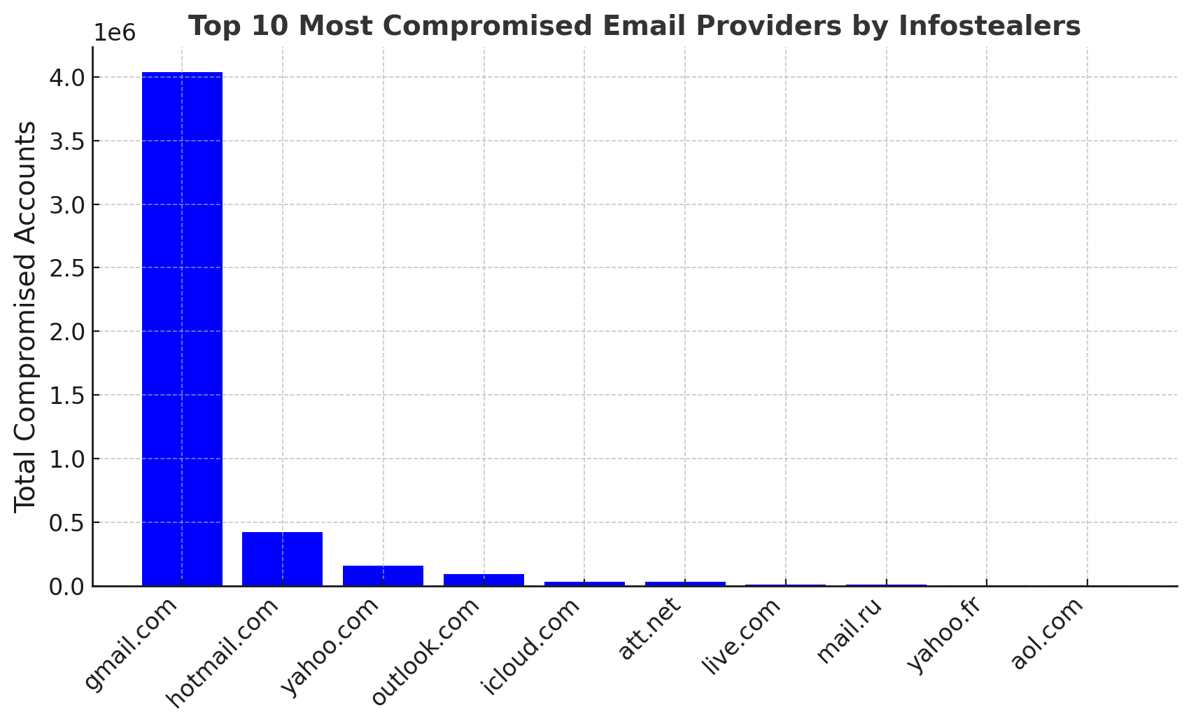 Email Providers: Gmail dominates the list, with significantly higher compromise counts compared to other providers, underscoring its centrality in personal and professional communications.