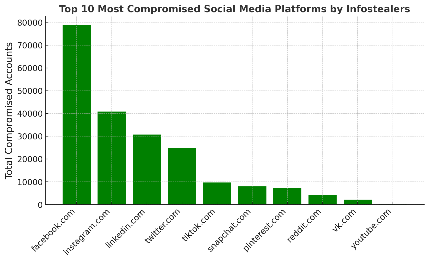Social Media Platforms: Facebook, Instagram, and Twitter top the list, showing that attackers continue to focus on accounts that can be abused for scams, influence operations, and secondary compromises.
